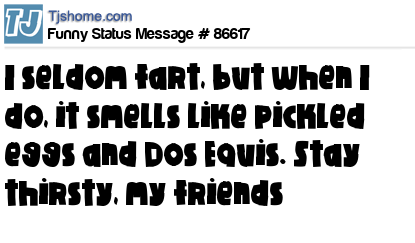 X I seldom fart, but when I do, it smells like pickled eggs and Dos Equis. Stay thirsty, my friends