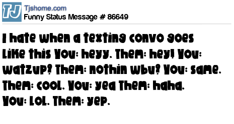 X is I hate when a texting convo goes like this You: heyy. Them: hey! You: watzup? Them: nothin wbu? You: same. Them: cool. You: yea Them: haha. You: lol. Them: yep.