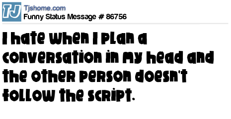 - # 29219 I hate when I plan out a conversation with someone in my head and they don't follow the script.