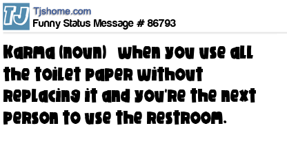 X says karma (noun) –when you use all the toilet paper without replacing it and you're the next person to use the restroom.