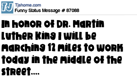 X says In honor of Dr. Martin Luther King I will be marching 12 miles to work today in the middle of the street....