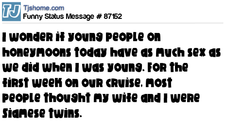X  I wonder if young people on honeymoons today have as much sex as we did when I was young. For the first week on our cruise, most people thought my wife and I were Siamese twins.