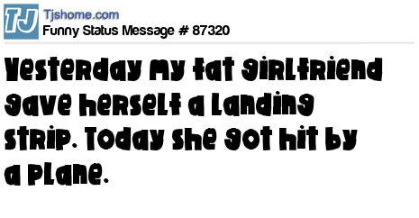 X Yesterday my fat girlfriend gave herself a landing strip. Today she got hit by a plane.