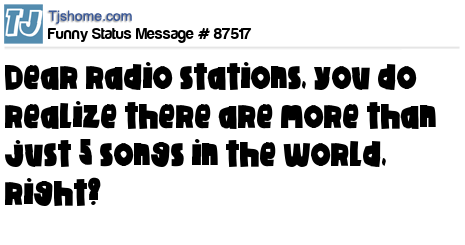 - # 91205 Dear radio stations, You do know there are more than 5 songs in the world, right? Sincerly annoyed listeners.