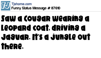 X Saw a Cougar wearing a Leopard coat, driving a Jaguar. It's a jungle out there.