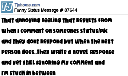X that annoying feeling that results from when I comment on someones status/pic and they dont respond but when the next person does..they write a novel response and yet still ignoring my comment and I'm stuck in between