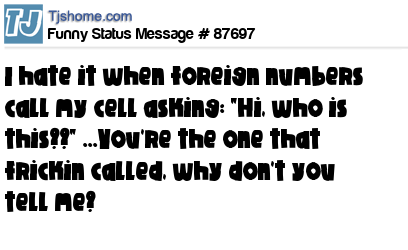 X I hate it when foreign numbers call my cell asking: "Hi, who is this??" ...You're the one that frickin called, why don't you tell me?