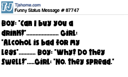 X Boy: "Can I buy you a drink?"..................... Girl: "Alcohol is bad for my legs"........... Boy: "Why? Do they Swell?".....Girl: "No, they spread."