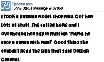 X I took a Russian model shopping. Got her lots of stuff. She called home and I overheard her say in Russian, "Mama, he eece a verry rich man!" Good thing she couldn't read the sign that said 'Dollar General'.
