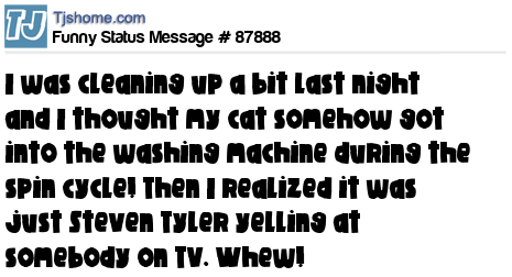 X is I was cleaning up a bit last night and I thought my cat somehow got into the washing machine during the spin cycle! Then I realized it was just Steven Tyler yelling at somebody on TV. Whew!