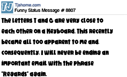 - # 30688 It recently became apparent to me that the letters 'T' and 'G' are far too close together on a keyboard. This is why I'll never be ending an e-mail with the phrase "Regards" ever again.