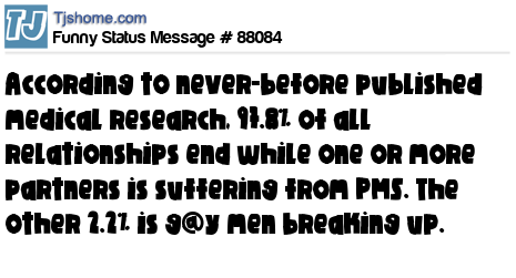 X According to never-before published medical research, 97.8% of all relationships end while one or more partners is suffering from PMS. The other 2.2% is g@y men breaking up.