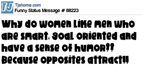 X is Why do women like men who are smart, goal oriented and have a sense of humor?? Because opposites attract!!