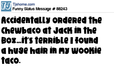 X accidentally ordered the Chewbaco at Jack in the Box…it's terrible I found a huge hair in my wookie taco.