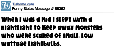 - # 138939 When I was a kid I slept with a nightlight... to keep away monsters who were scared of small, low wattage light bulbs.