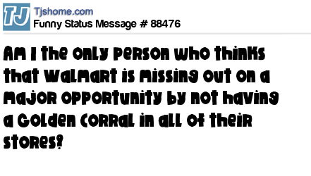 - # 168011 Am I the only person who thinks that Walmart is missing out on a major opportunity by not having a Golden Corral at all of their stores?