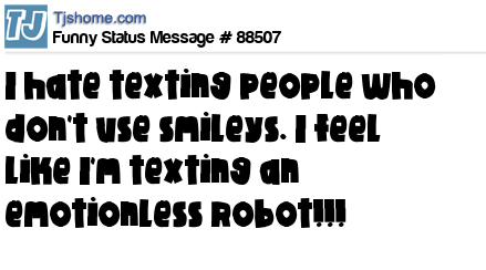 X is I hate texting people who don't use smileys. I feel like I'm texting an emotionless robot!!!