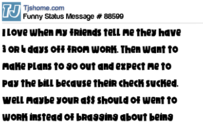 X is I love when my friends tell me they have 3 or 4 days off from work. Then want to make plans to go out and expect me to pay the bill because their check sucked. Well maybe your a$$ should of went to work instead of bragging about being off.