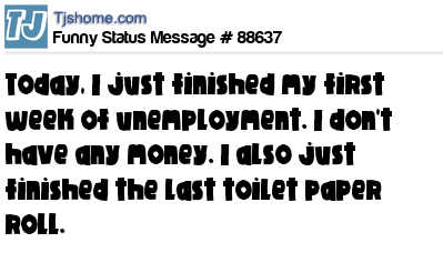 X is Today, I just finished my first week of unemployment. I don't have any money. I also just finished the last toilet paper roll.