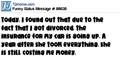 X is Today, I found out that due to the fact that I got divorced, the insurance for my car is going up. A year after she took everything, she is still costing me money.