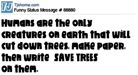 - # 117087 Humans are the only creatures on earth that will cut down trees, make paper, then write "Save Trees" on them...