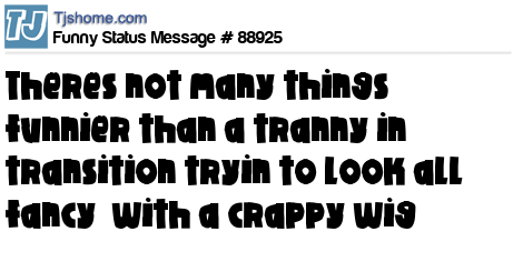 X is theres not many things funnier than a tranny in transition tryin to look all fancy  with a crappy wig