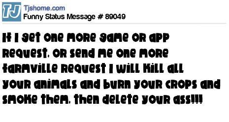 X says If I get one more game or app request, or send me one more farmville request I will kill all your animals and burn your crops and smoke them, then delete your ass!!!