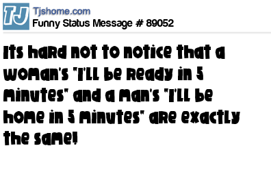 - # 175856 Have you ever noticed that when a woman says "I'll be ready in 5 minutes." it's the same length of time as when a man says "I'll be home in 5 minutes?"