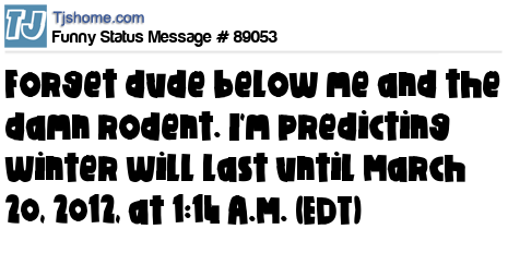 X Forget dude below me and the damn rodent. I'm predicting winter will last until March 20, 2012, at 1:14 A.M. (EDT)