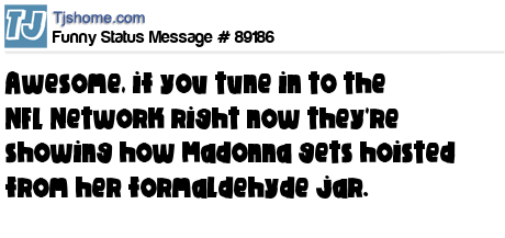 X Awesome, if you tune in to the NFL Network right now they're showing how Madonna gets hoisted from her formaldehyde jar.