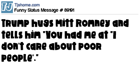 X is Trump hugs Mitt Romney and tells him "You had me at "I don't care about poor people'."