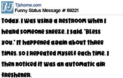 X is Today, I was using a restroom when I heard someone sneeze. I said, "Bless you." It happened again about three times, so I repeated myself each time. I then noticed it was an automatic air freshener.