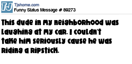 X This dude in my neighborhood was laughing at my car. I couldn't take him seriously cause he was riding a ripstick.