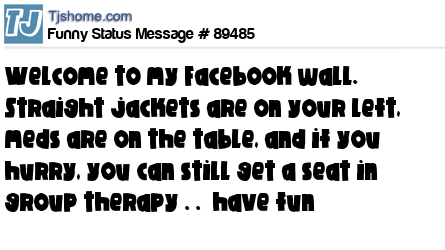 - # 75052 Welcome to my Facebook wall. Straight jackets are on your left, meds are on the table, and if you hurry, you can still get a seat in group therapy . . . have fun!