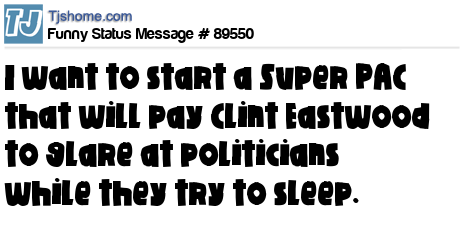 X I want to start a Super PAC that will pay Clint Eastwood to glare at politicians while they try to sleep.
