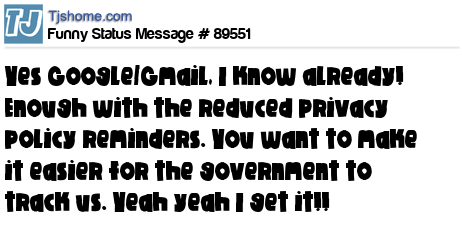 X Yes Google/Gmail, I know already! Enough with the reduced privacy policy reminders. You want to make it easier for the government to track us. Yeah yeah I get it!!