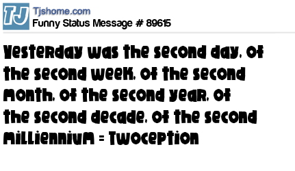 X is Yesterday was the second day, of the second week, of the second month, of the second year, of the second decade, of the second milliennium = Twoception