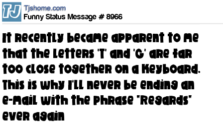 - # 30688 It recently became apparent to me that the letters 'T' and 'G' are far too close together on a keyboard. This is why I'll never be ending an e-mail with the phrase "Regards" ever again.