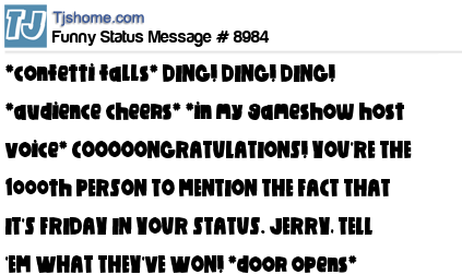 X *confetti falls* DING! DING! DING! *audience cheers* *in my gameshow host voice* COOOOONGRATULATIONS! YOU'RE THE 1000th PERSON TO MENTION THE FACT THAT IT'S FRIDAY IN YOUR STATUS. JERRY, TELL 'EM WHAT THEY'VE WON! *door opens* ABBBBBBSOLUTELY NOTHING!!!!