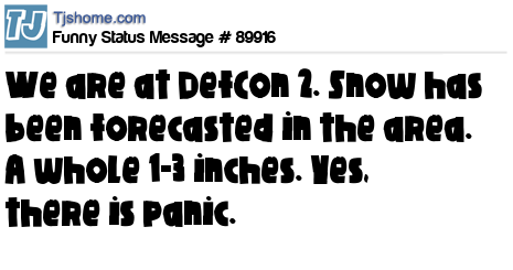 X says We are at DefCon 2. Snow has been forecasted in the area. A whole 1-3 inches. Yes, there is panic.
