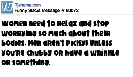 X Women need to relax and stop worrying so much about their bodies. Men aren't picky! Unless you're chubby or have a wrinkle or something.