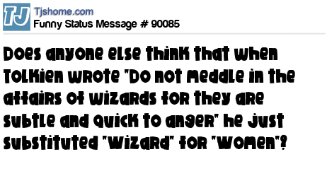 X Does anyone else think that when Tolkien wrote "Do not meddle in the affairs of wizards for they are subtle and quick to anger" he just substituted "Wizard" for "Women"?