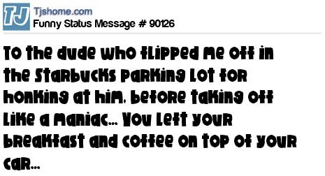 - # 90124 To the dude who flipped me off in the Subway parking lot for honking at you, you left your dinner on top of your car.