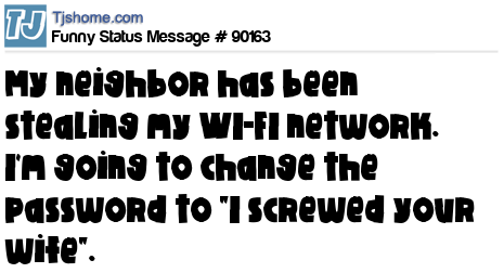 X My neighbor has been stealing my WI-FI network. I'm going to change the password to "I screwed your wife".