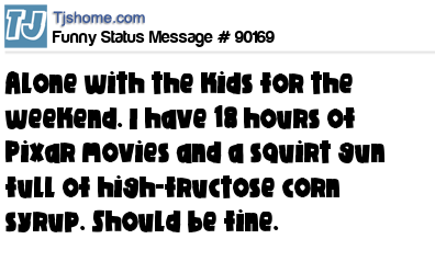 X is alone with the kids for the weekend. I have 18 hours of Pixar movies and a squirt gun full of high-fructose corn syrup. Should be fine.