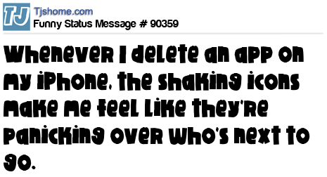 - # 91948 Whenever I delete an app on my iPhone, the shaking icons make me feel like they're panicking over who's next to go.