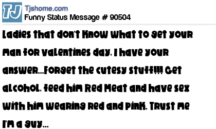 X Ladies that don't know what to get your man for valentines day, I have your answer...Forget the cutesy stuff!!! Get alcohol, feed him Red Meat and have sex with him wearing red and pink. Trust me I'm a guy...