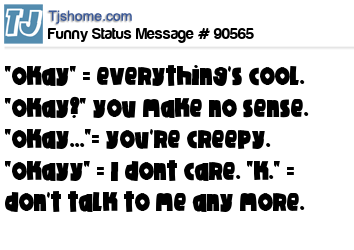 X "okay" = everything's cool. "okay?" you make no sense. "okay..."= you're creepy. "okayy" = I dont care. "k." = don't talk to me any more.