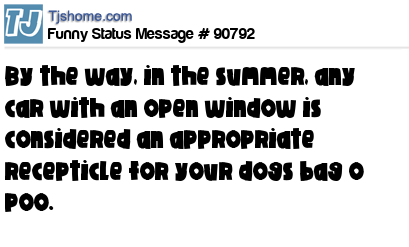 X is by the way, in the summer, any car with an open window is considered an appropriate recepticle for your dogs bag o poo.