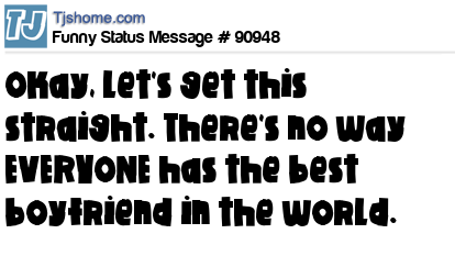 - # 91000 Okay, let's get this straight. There's no way EVERYONE has the best boyfriend in the world. Work it out amongst yourselves.
